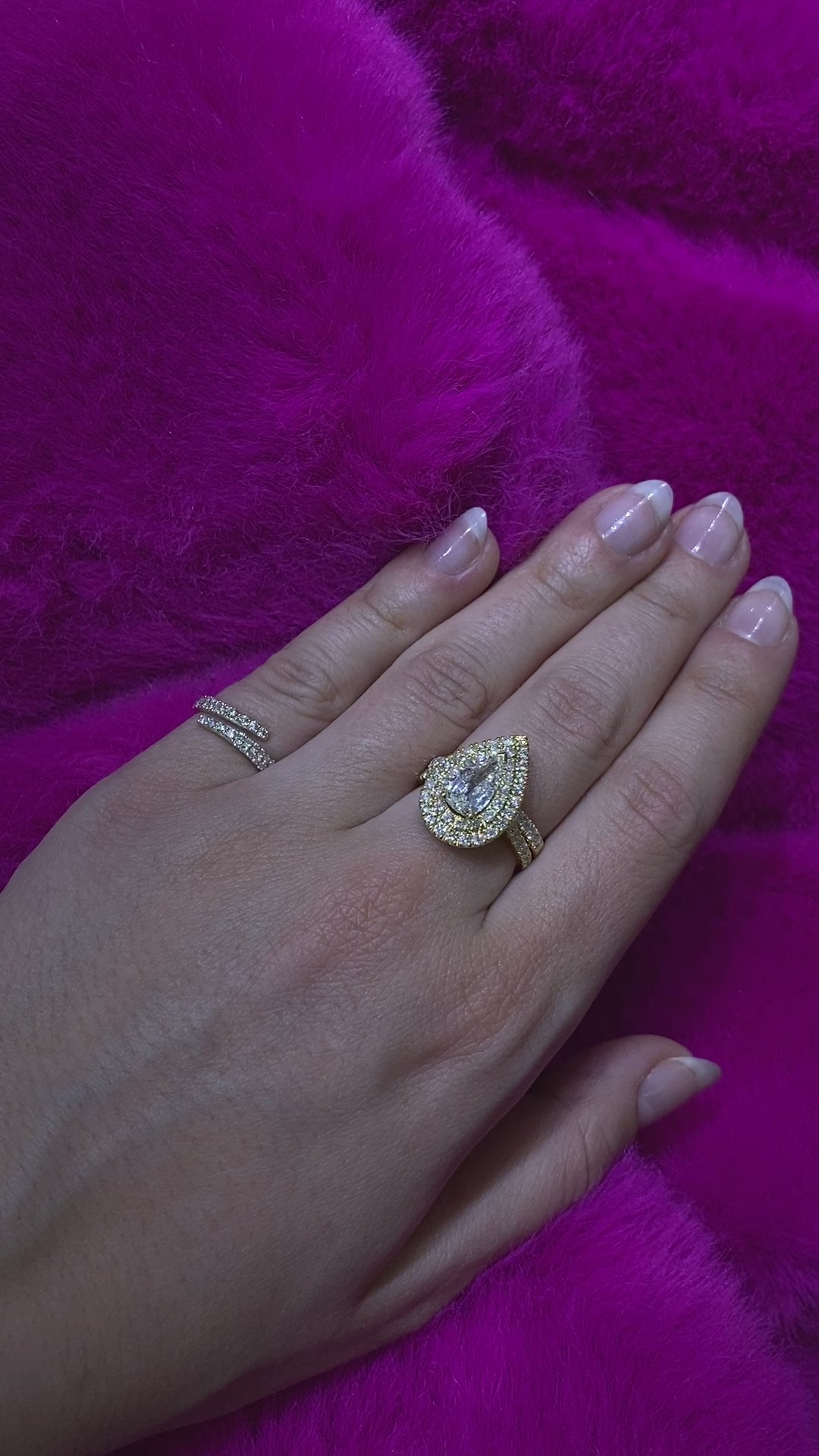 Elegance meets extravagance in this stunning Pear Shaped Double Halo Diamond Engagement Ring, set in lustrous 14K Yellow Gold. The pear-shaped diamond, with its unique teardrop silhouette, takes center stage, surrounded by a double halo of brilliant diamonds that amplify its radiance. A symbol of love and commitment, this ring combines timeless design with a touch of vintage-inspired glamour, making it the perfect choice for a memorable proposal.