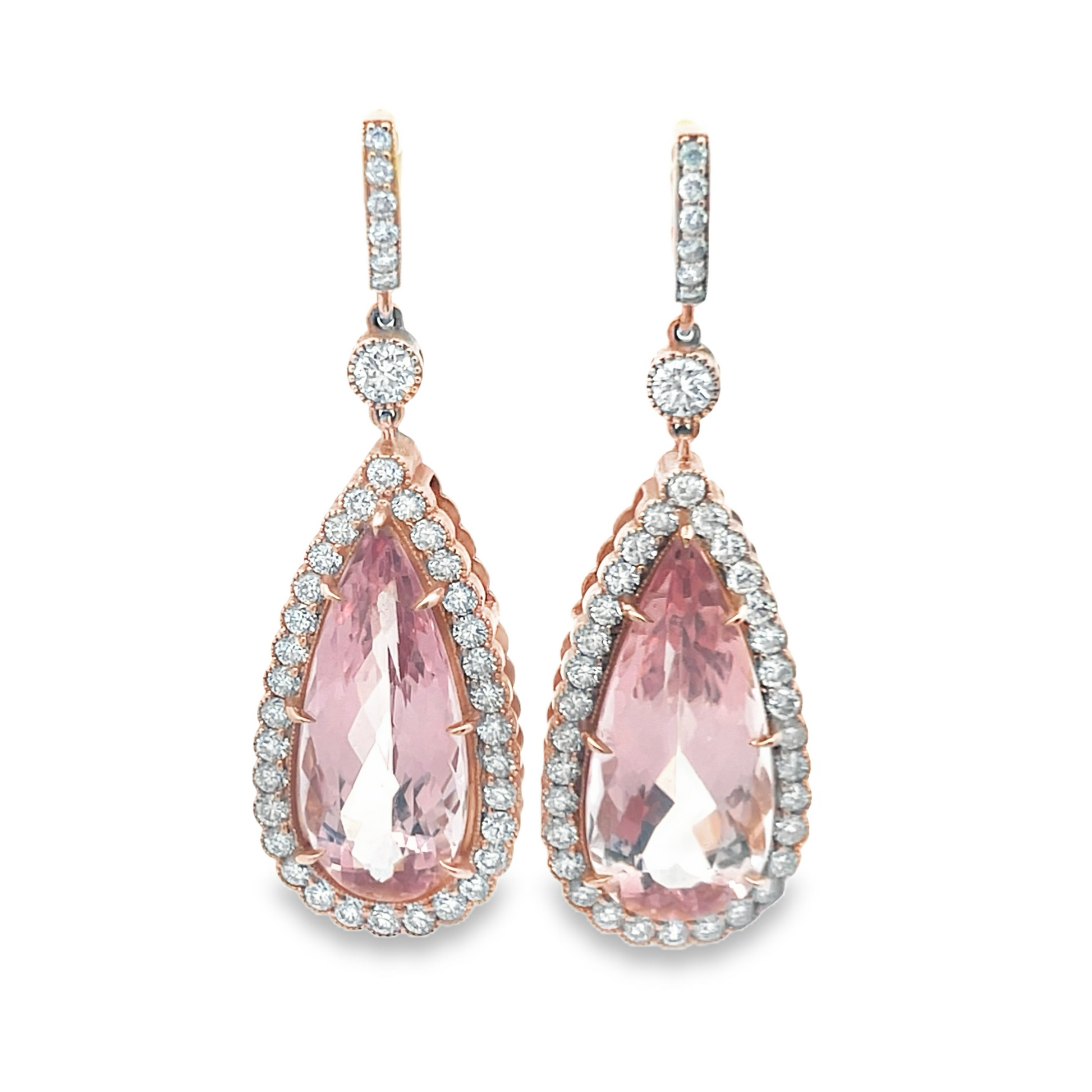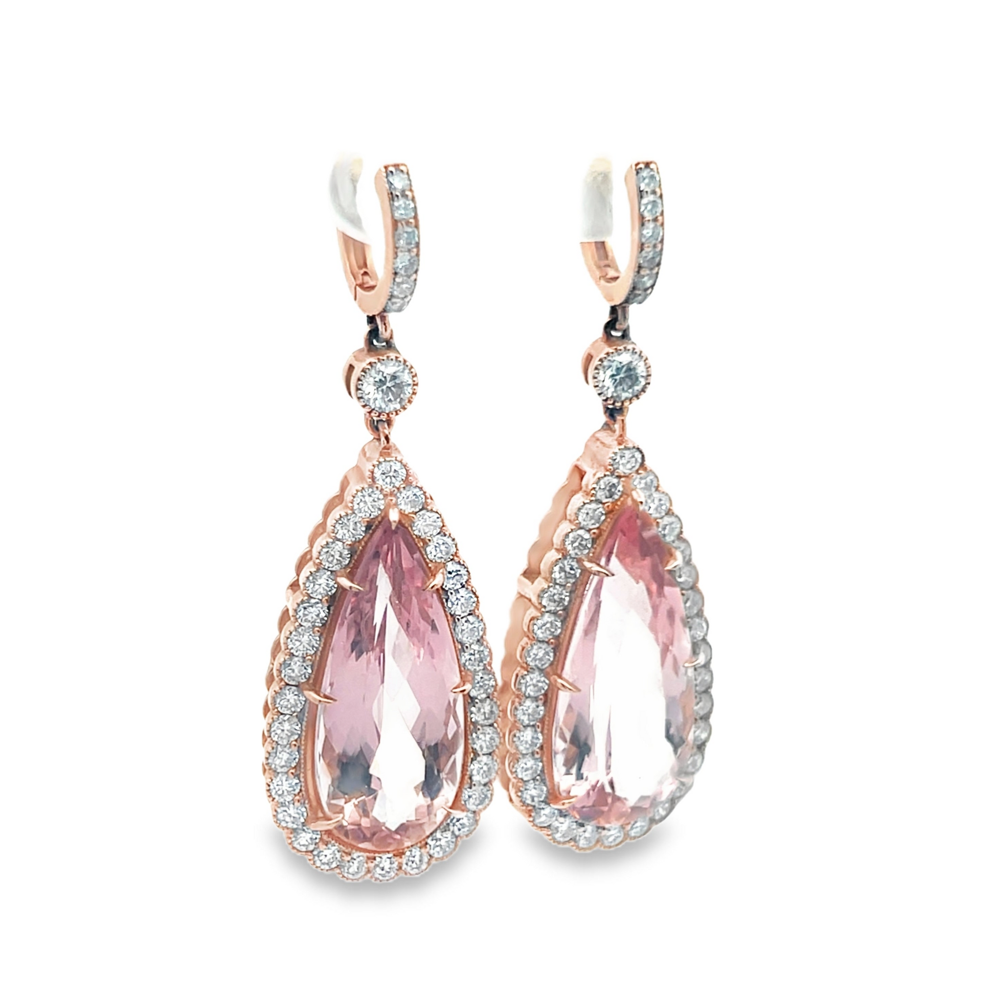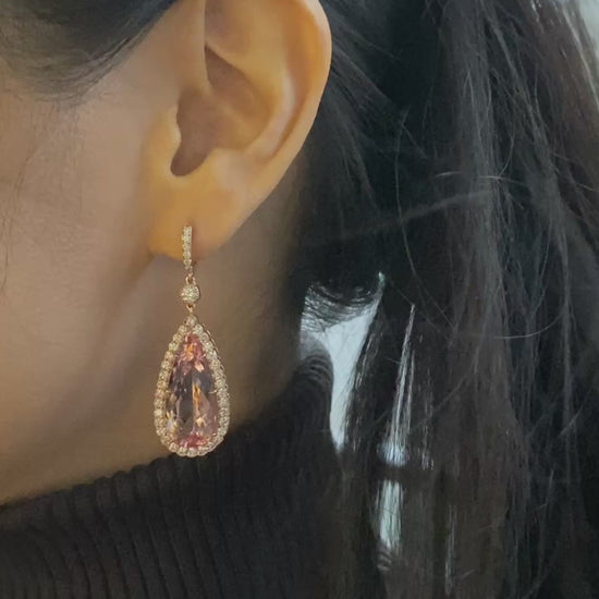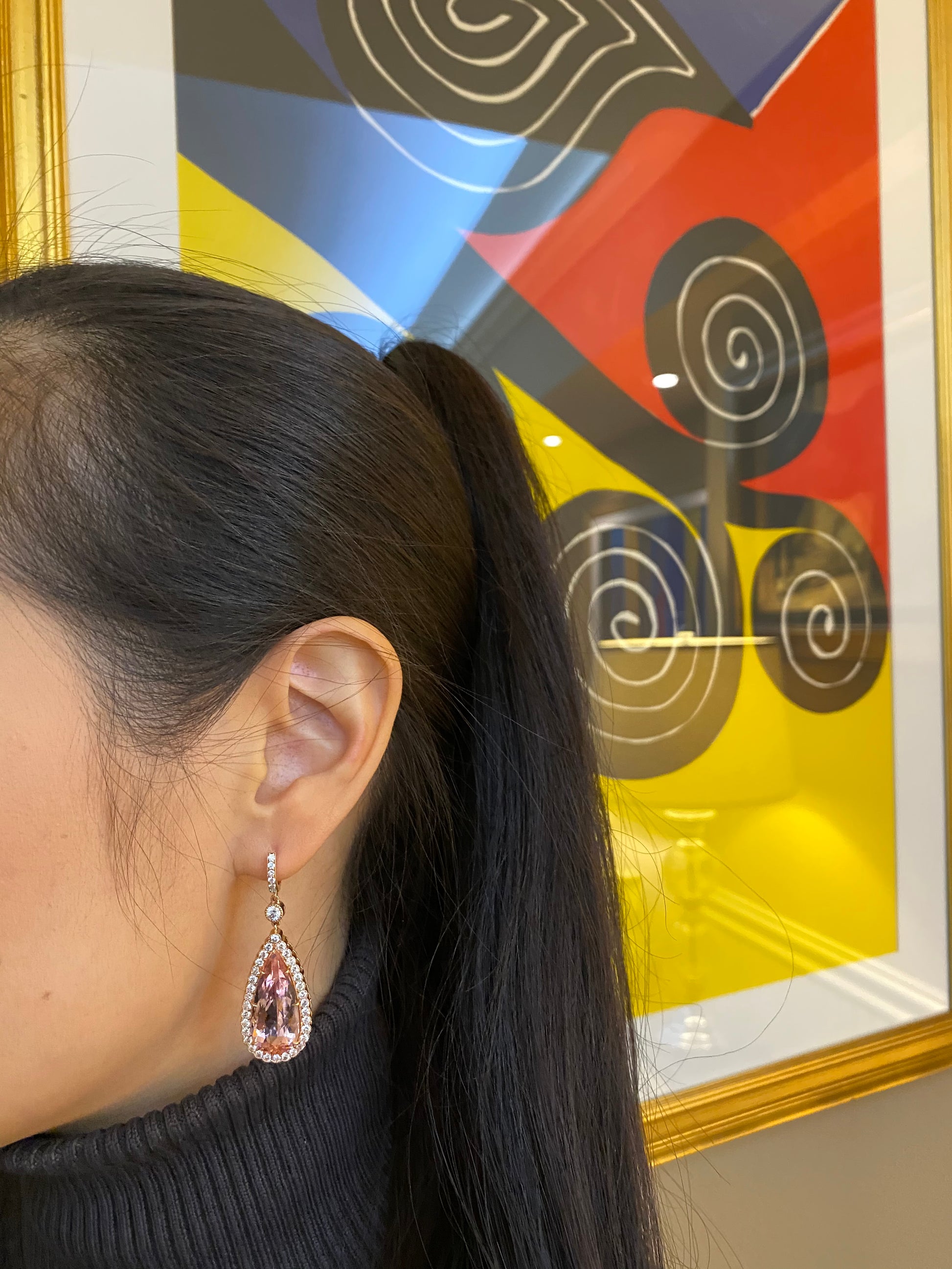 These charming earrings feature two pear-shaped 30 CT morganite gemstones. The gemstones are encompassed by brilliant round-cut diamonds in a 14K Rose Gold Setting.