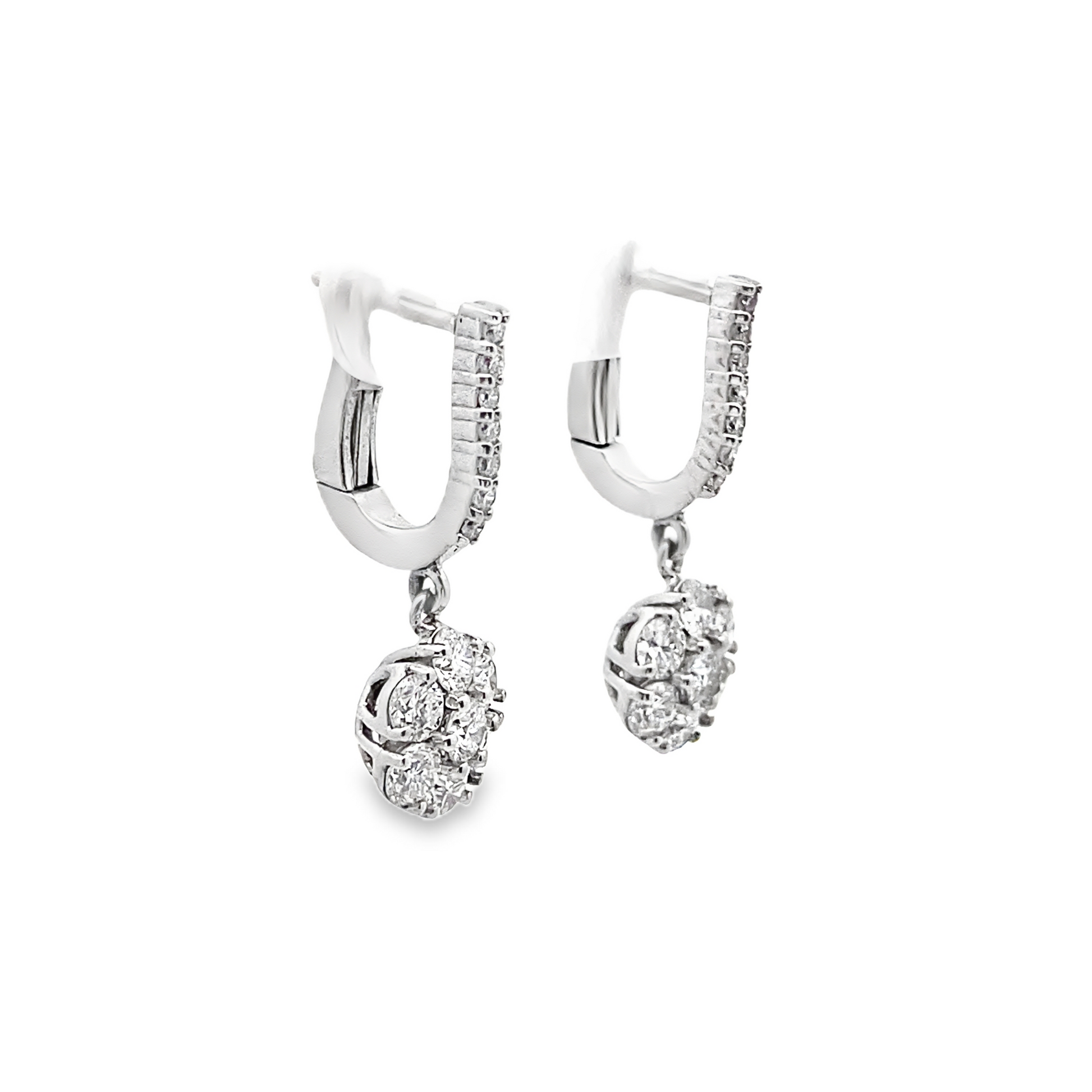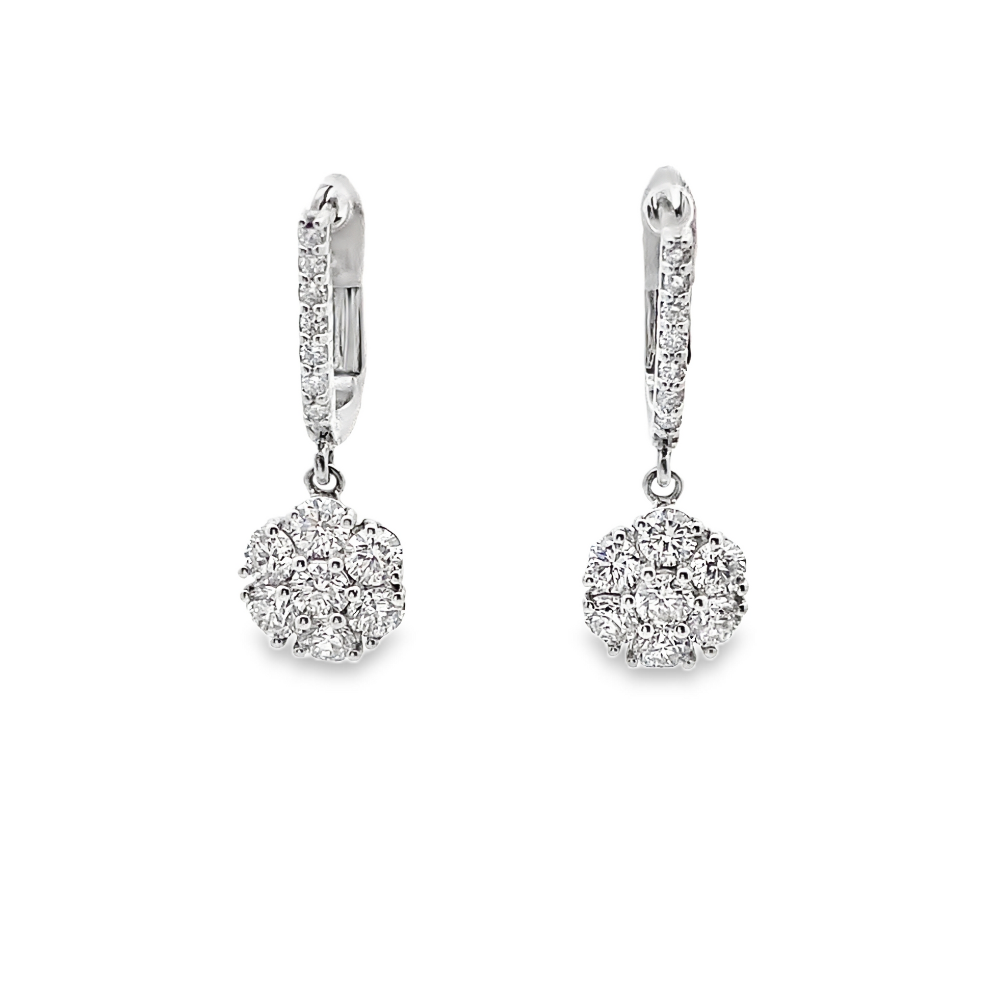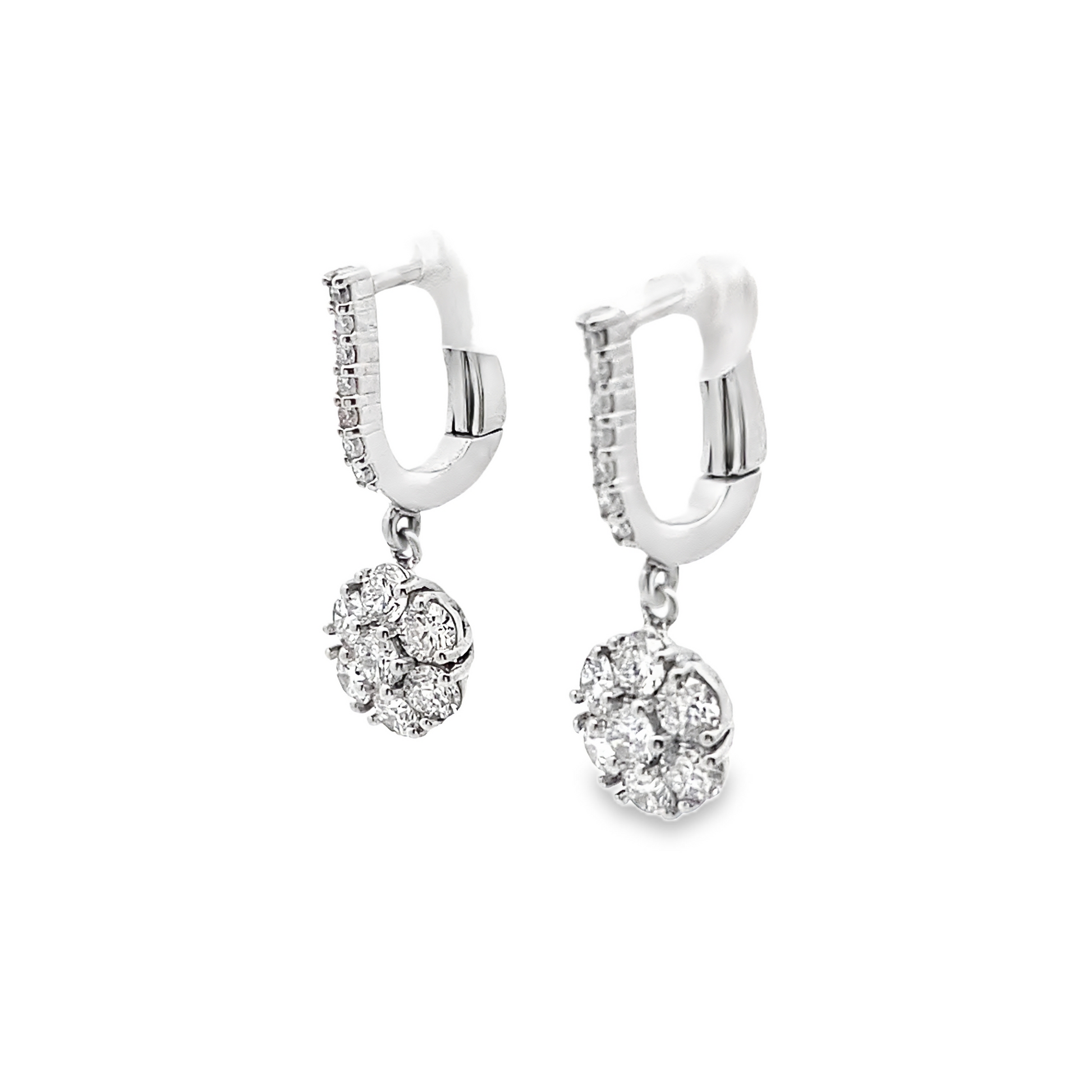 These alluring floral shaped cluster diamond dangling earrings showcase Brilliant Round-Cut Diamonds set in 14k White or Yellow Gold. A simply graceful gift for yourself or for a significant one that will catch eyes everywhere you go!