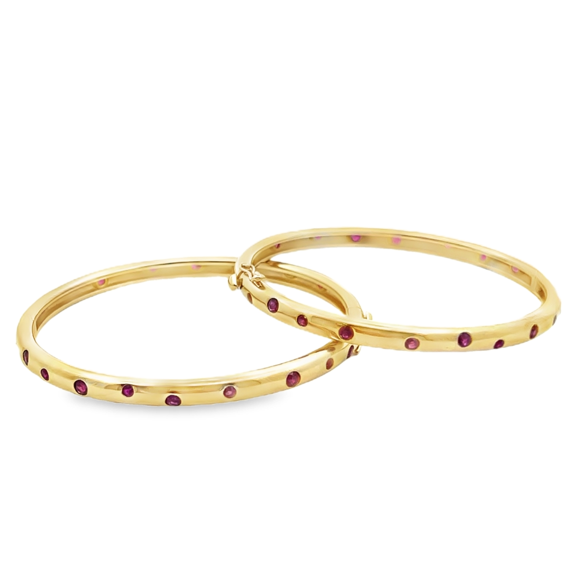 This elegant bangle bracelet features deep red ruby stones set in 14K gold for a classic and luxurious look. Handcrafted with precision, this bracelet is a timeless addition to any jewelry collection. The rich color and durable materials make it the perfect accessory for any occasion.