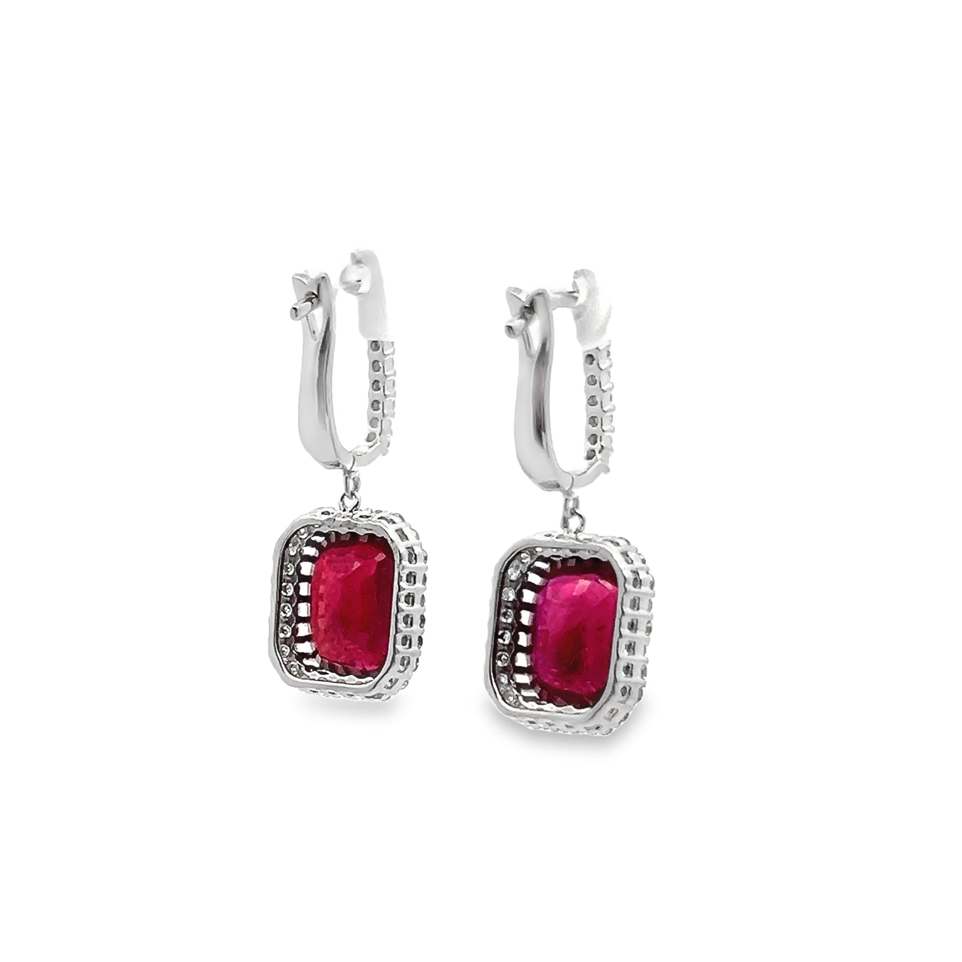 Ruby Leverback Drop Earrings with Diamond Halo in 14K White Gold