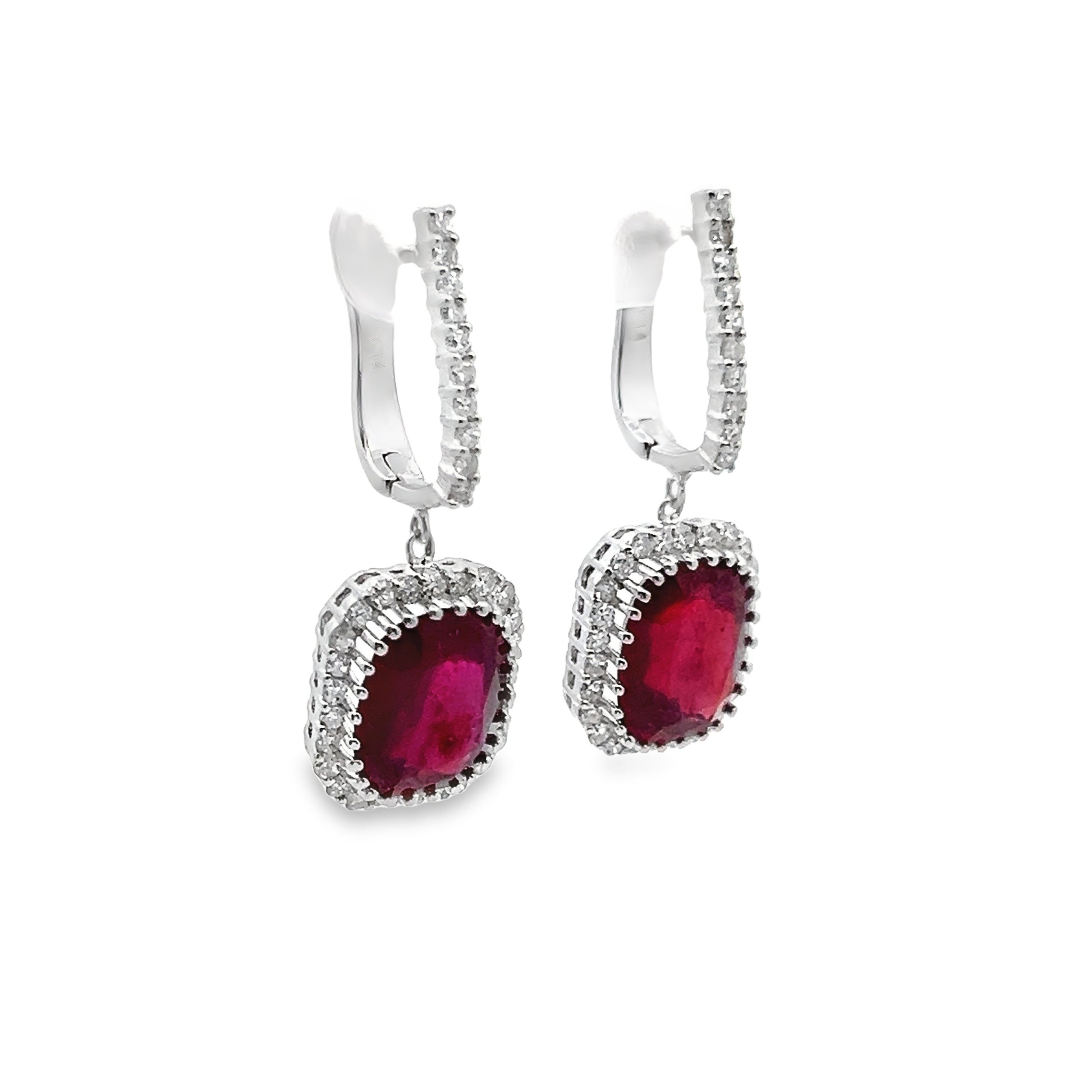 These timeless and feminine beauties feature cushion-cut ruby and are surrounded by sparkling diamond halos, set in high polished 14k white gold. These drop earrings are secured with lever-backs