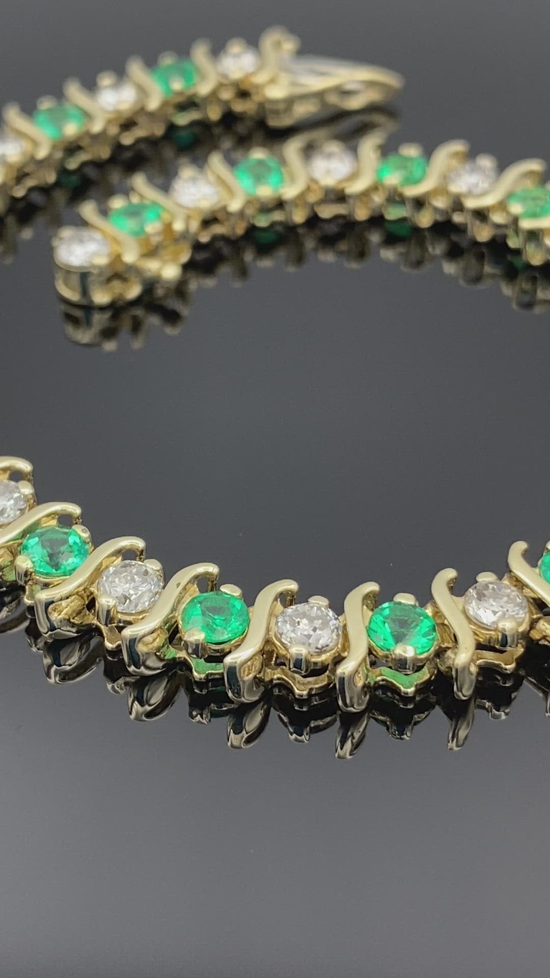 The tennis-style bracelet features a prong-set round brilliant-cut emeralds and diamonds, accented with "S" shaped spacers. It finished with a hidden box clasp
