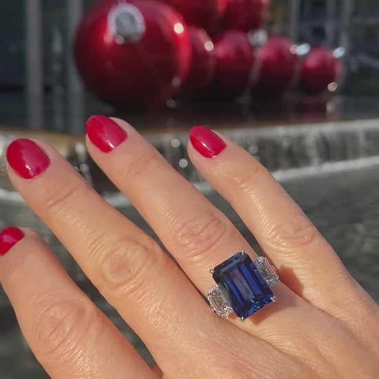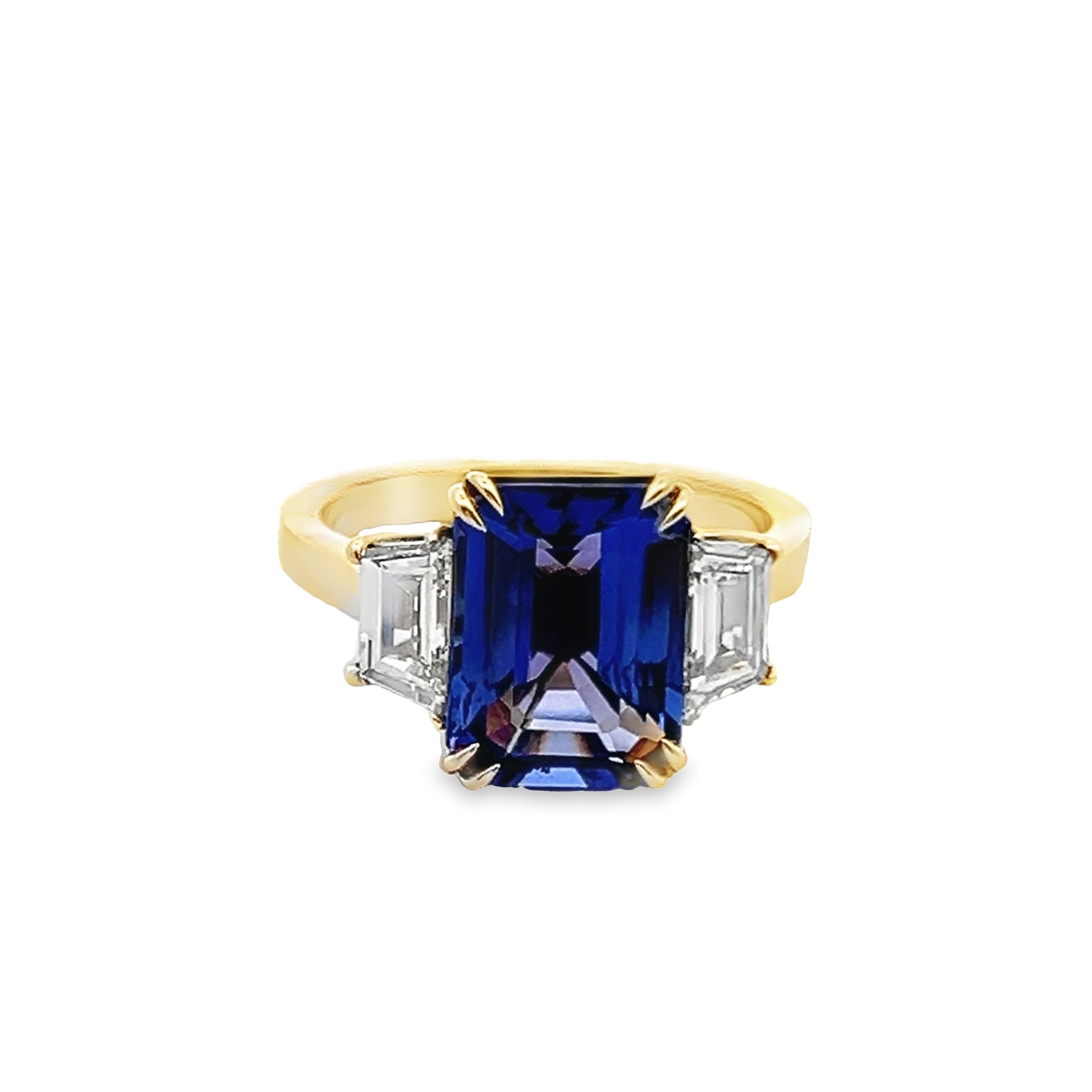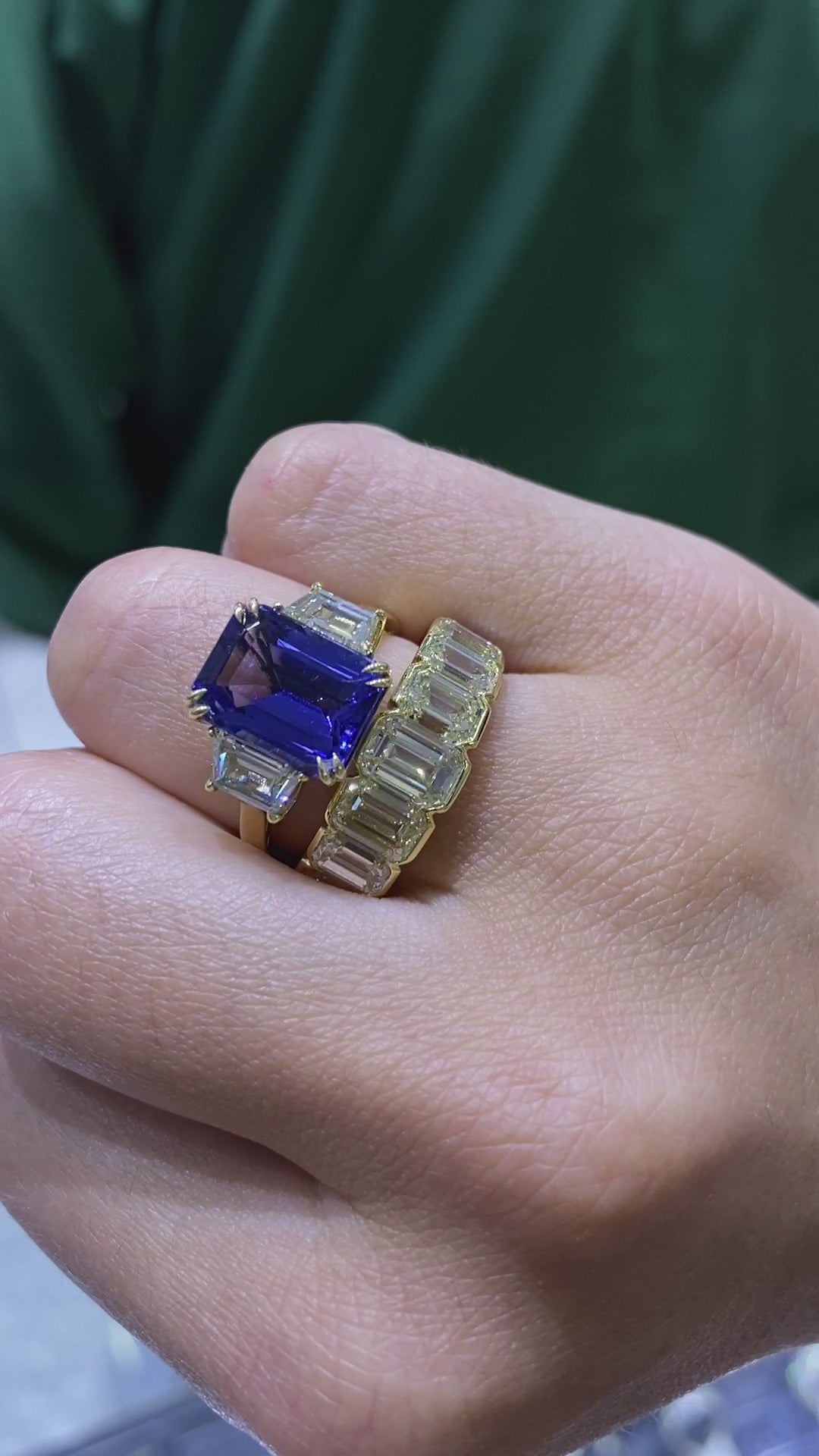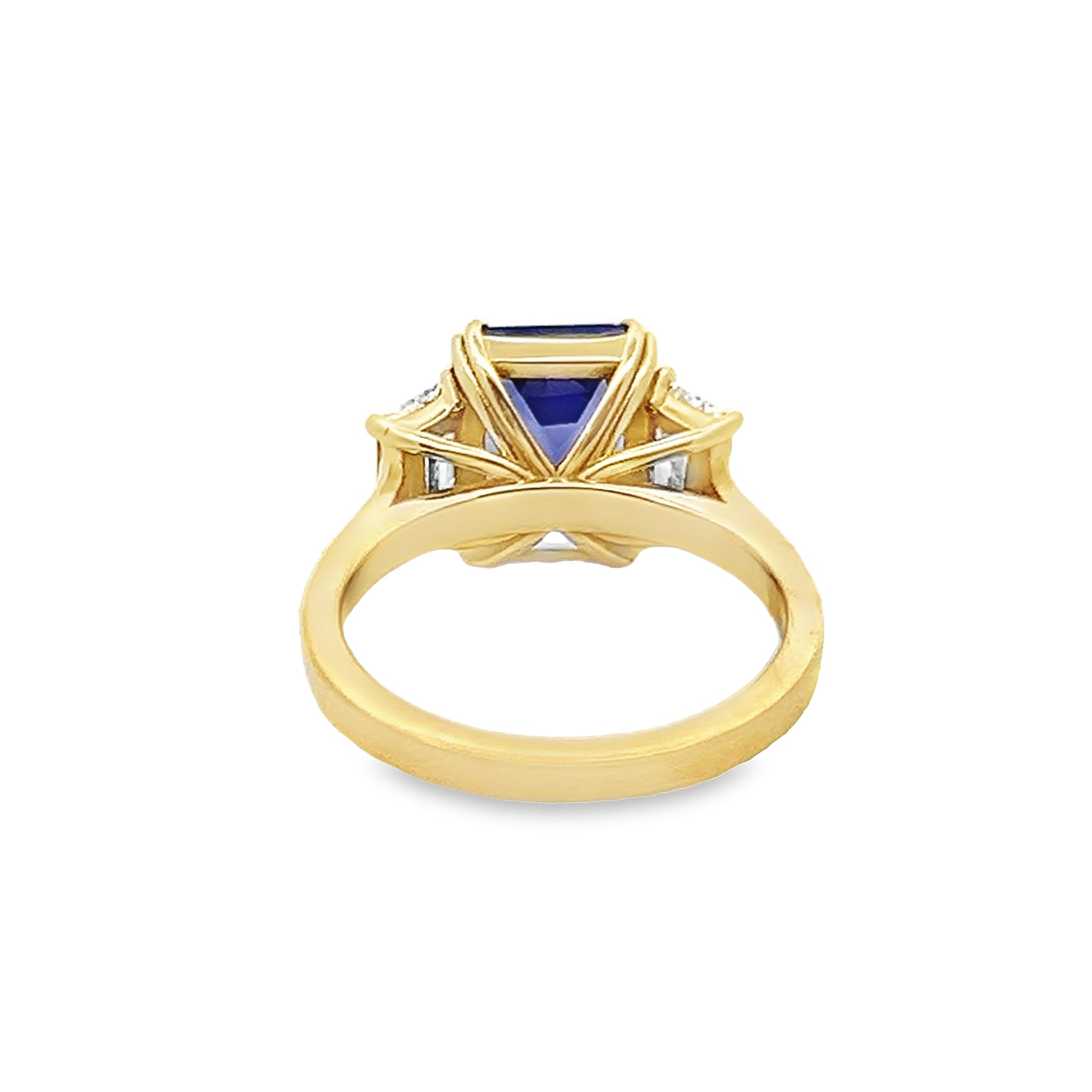 This Three-Stone Tanzanite and Diamond Ring in 18K Yellow Gold is a dazzling piece that will add a pop of color to any outfit. Featuring a trio of a Tanzanite Gemstone and sparkling trapezoid diamond accents, this ring is crafted in 18K Yellow Gold for a luxurious touch. A must-have for any jewelry collection!