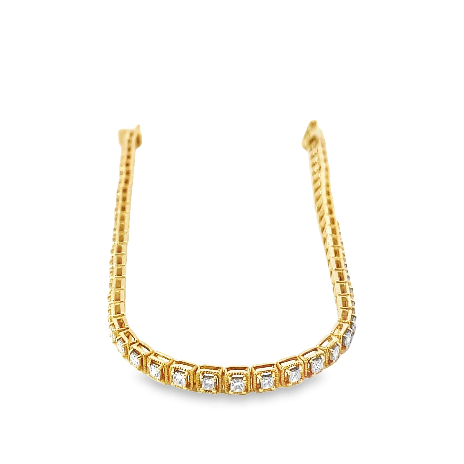 Elevate your elegance with our exquisite 14k yellow gold tennis bracelet, designed to capture the timeless allure of vintage and antique styles. Its delicate mill grain detailing adds a touch of old-world charm, while the dazzling 1.7-carat diamonds, meticulously selected for their VS clarity and F/G color, will effortlessly adorn your wrist with a brilliant, timeless sparkle. Embrace the sophistication of a bygone era while embracing the enduring beauty of fine craftsmanship.