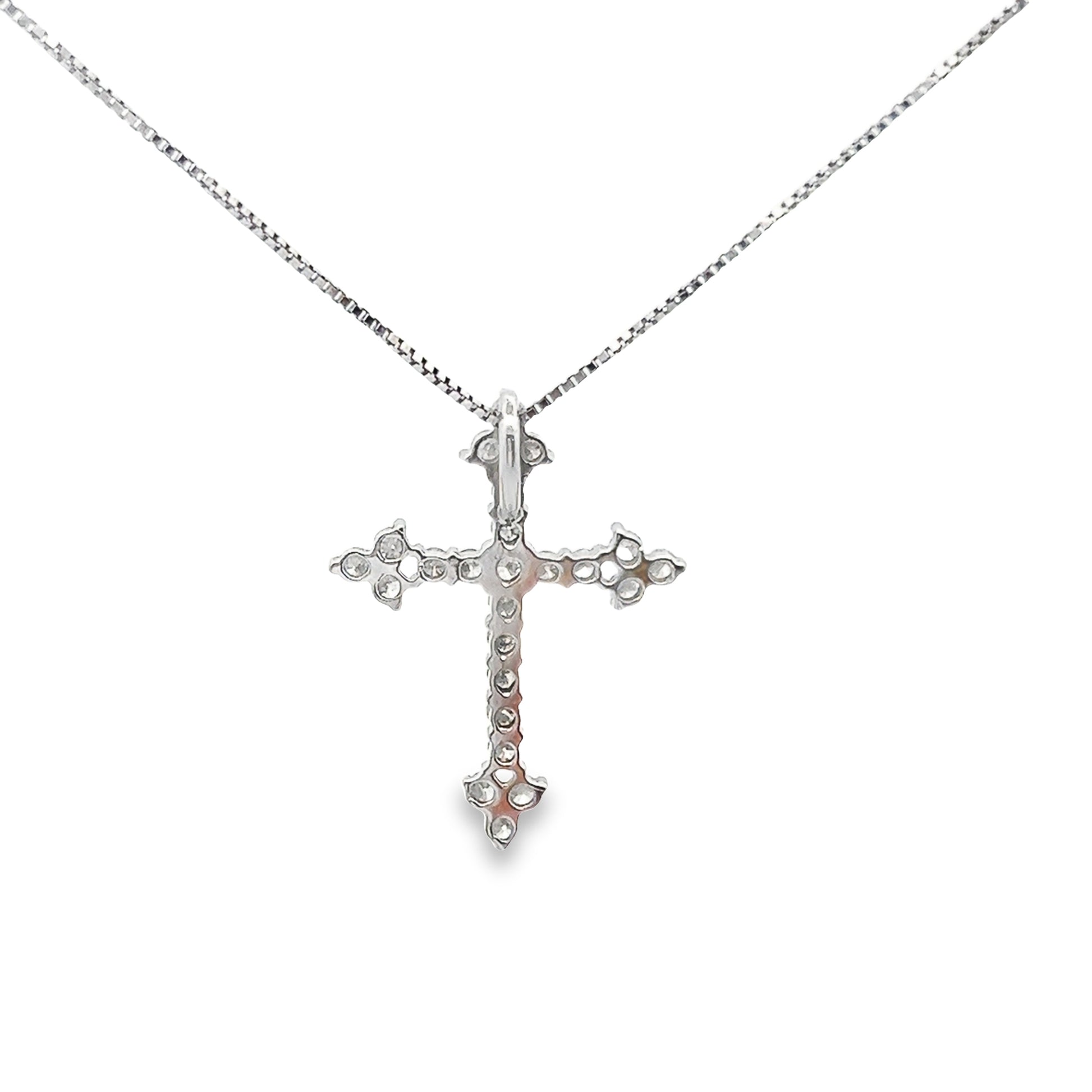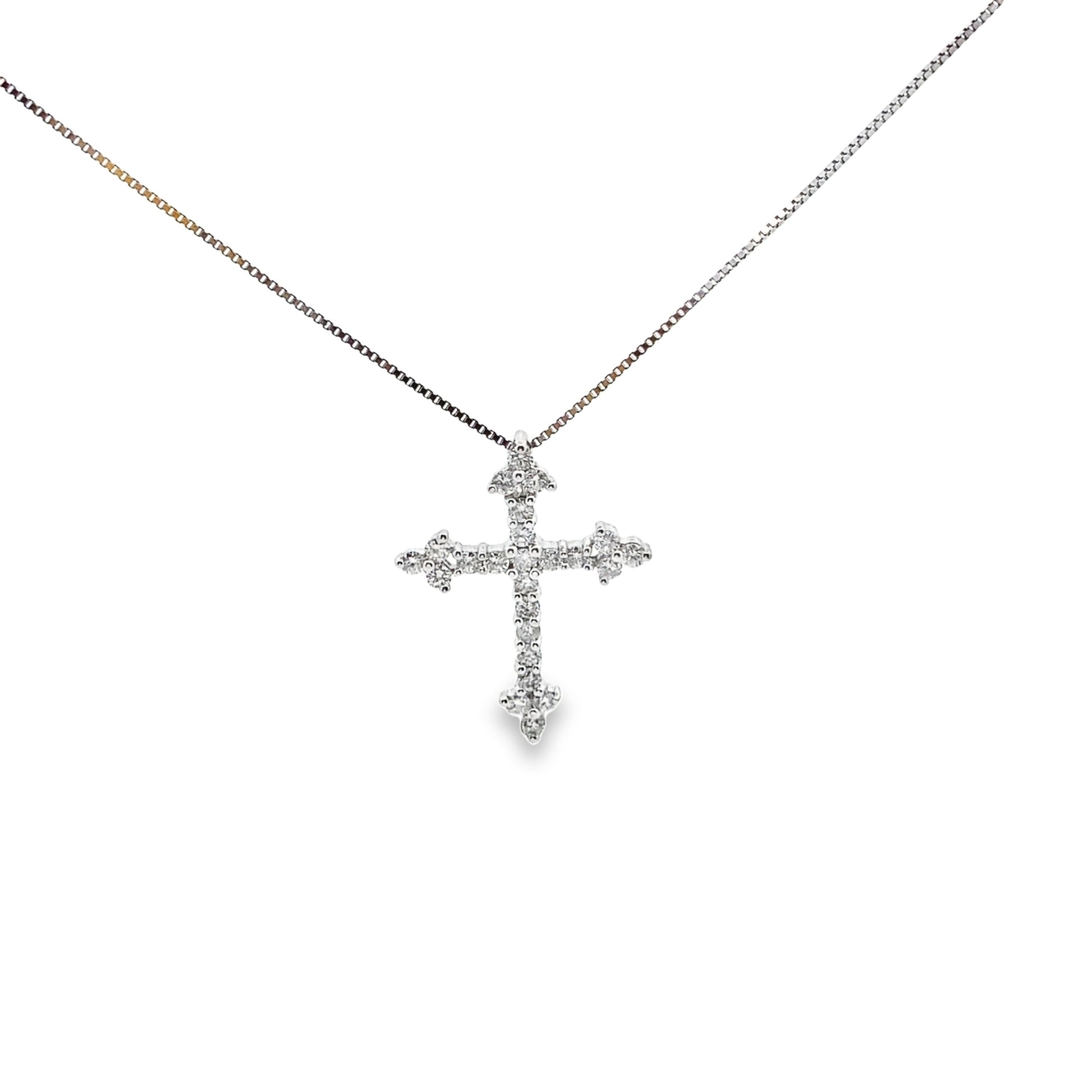 This stunning Three point Diamond Cross Necklace in 14K White Gold is a symbol of beauty, faith, and elegance. With its intricate design and three dazzling diamonds at each end, it will add a touch of sophistication to any outfit. The perfect gift for yourself or a loved one, this necklace is sure to become a treasured piece.