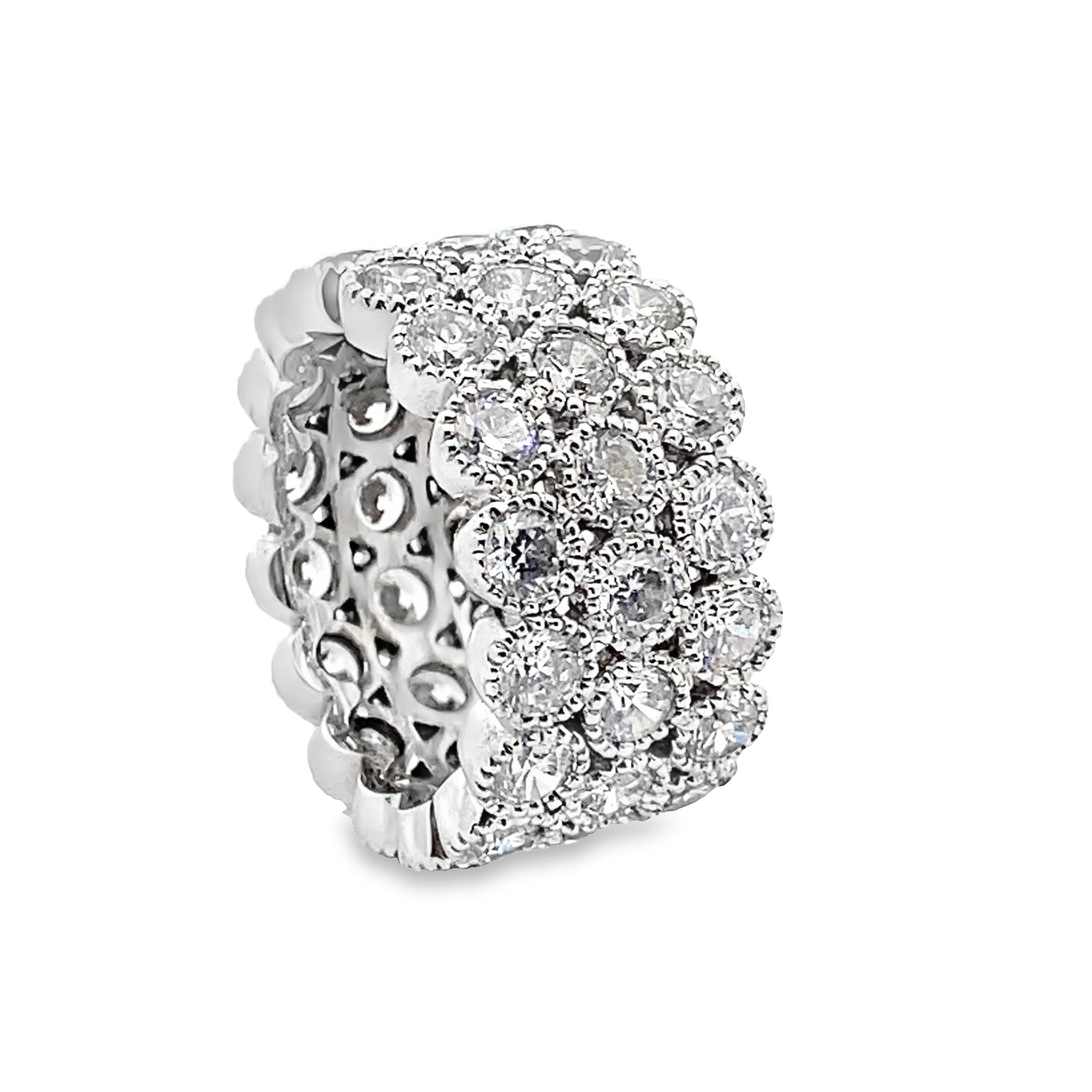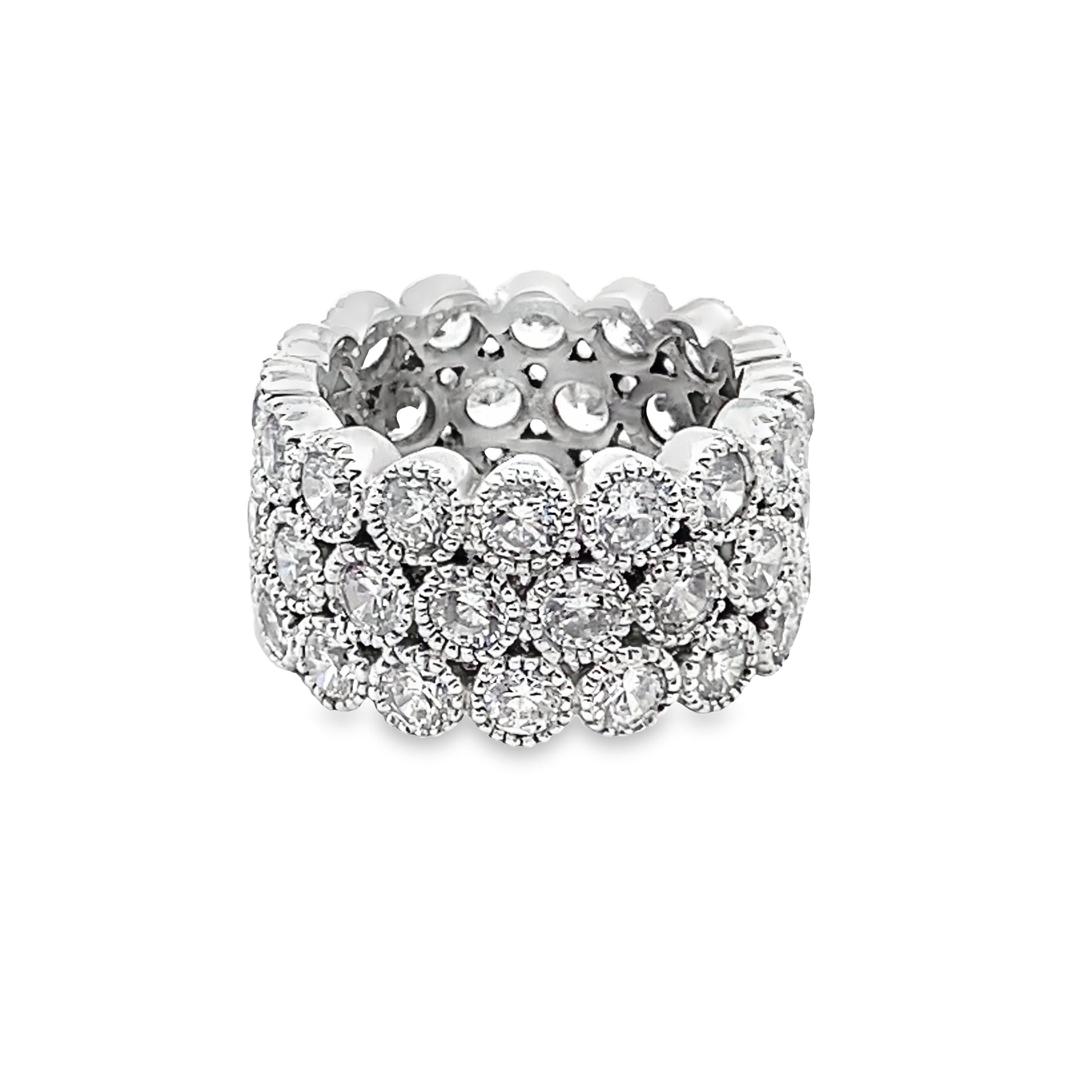 This stylish eternity ring studded with three rows of brilliant round-cut diamonds, instantly draws the eyes. The diamonds are secured in a 14k white gold bezel setting. This stunning statement ring can be worn from day to night and is definitely a showstopper in its own right
