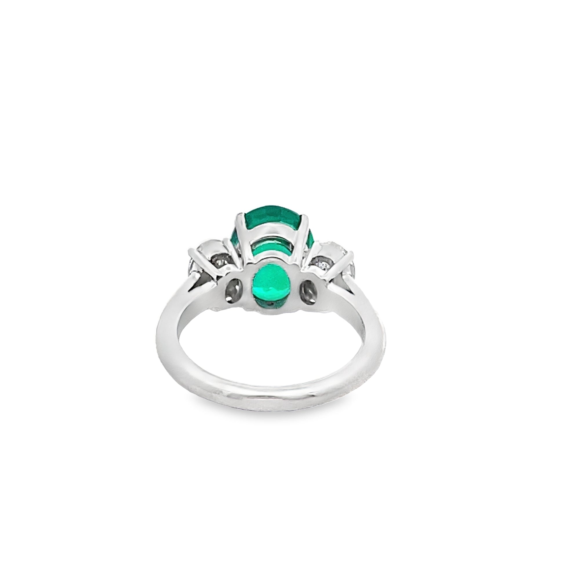 This beautiful oval-cut emerald in prong setting mesmerizes with its lovely green hue. Brilliant oval-cut side diamonds accent the center stone.