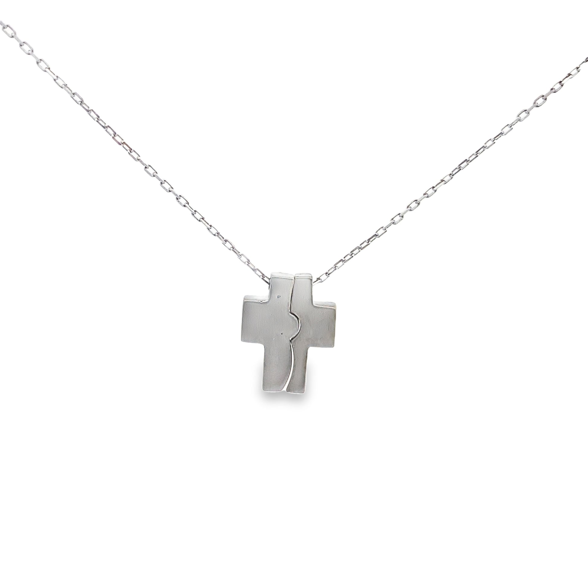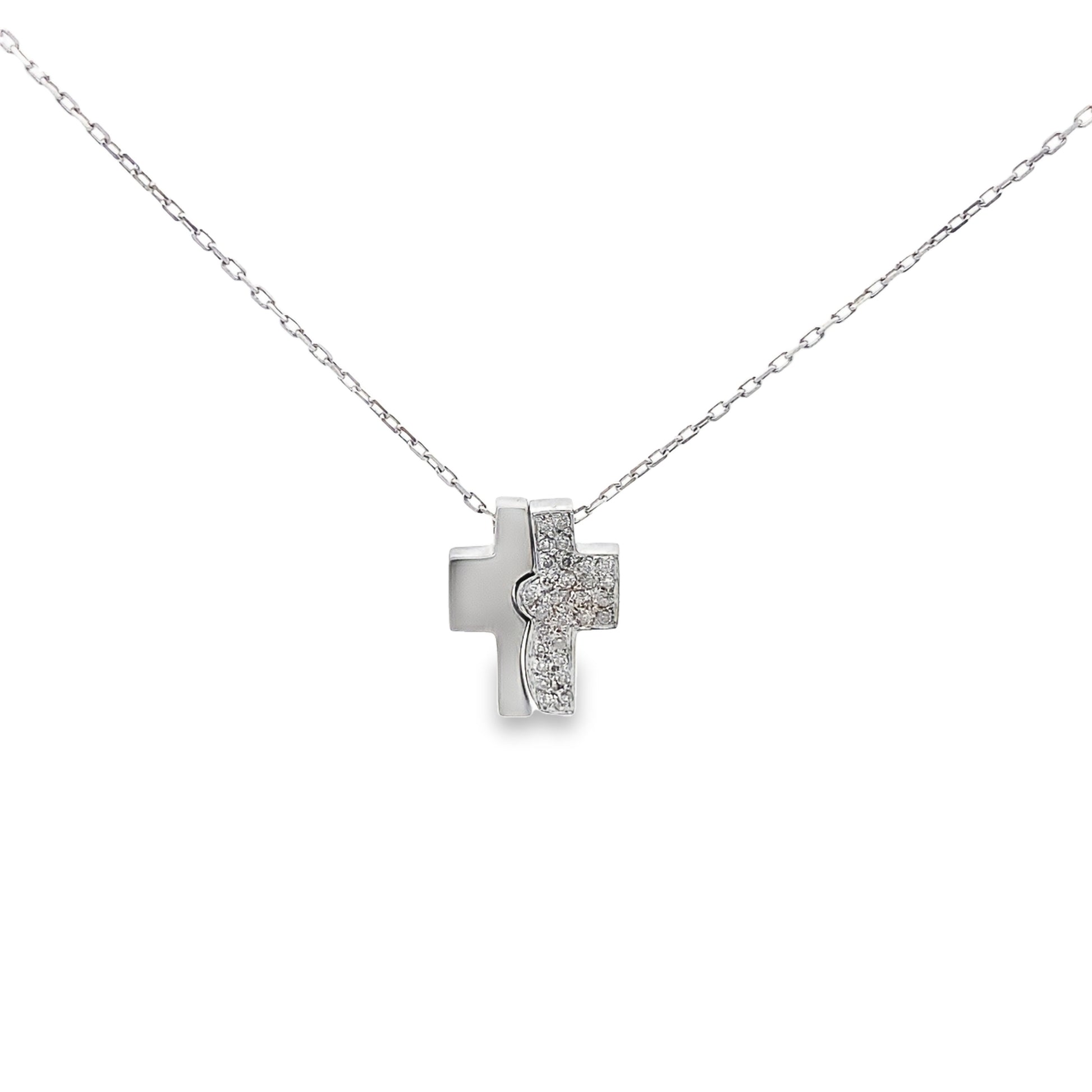 This stunning two piece diamond cross necklace in 14K white gold is the perfect gift to share with a loved one. The sparkling round cut diamonds add an extra touch of elegance and timeless beauty to this classic piece. A meaningful and stylish accessory for any occasion.