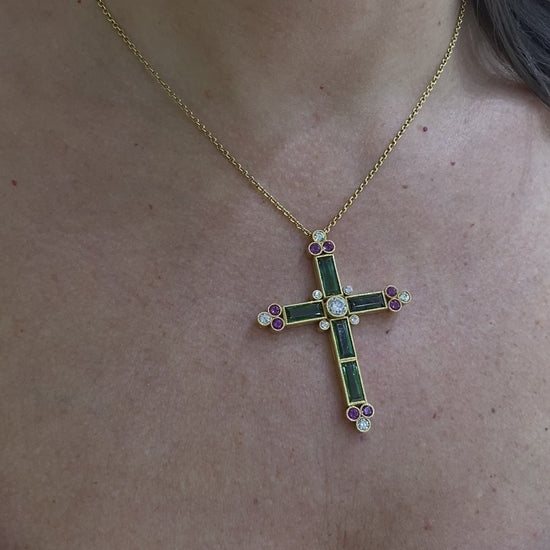Statement Diamond and Green Tourmaline Cross Pendant Necklace in 18K Yellow Gold